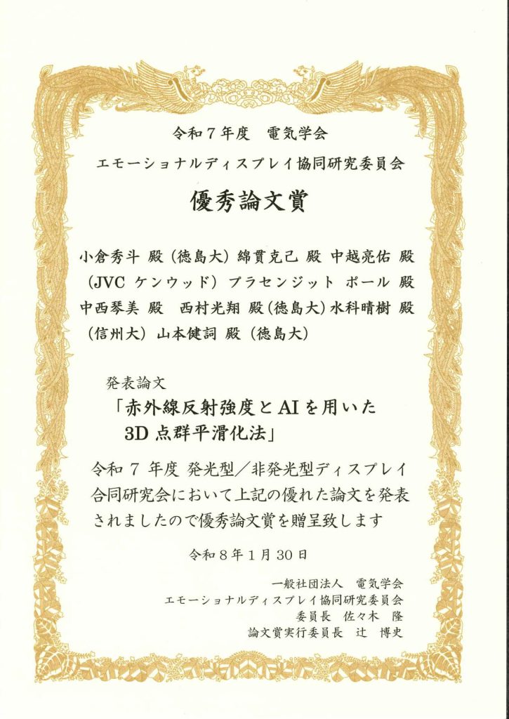 当研究室の小倉 秀斗が,発光型/非発光型ディスプレイ合同研究会(2026.1.29,30, サンポート高松,香川県高松市)にて 令和7年度電気学会エモーショナルディスプレイ協同研究委員会優秀論文賞 を受賞しました